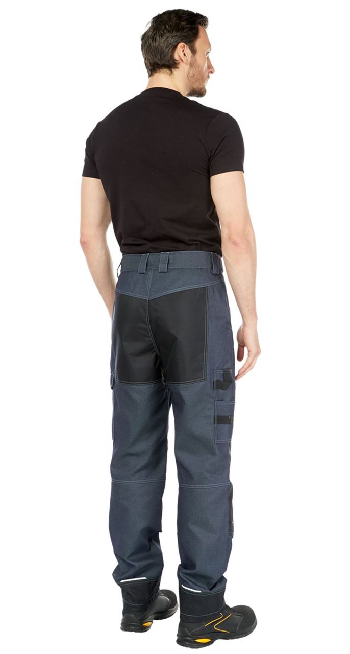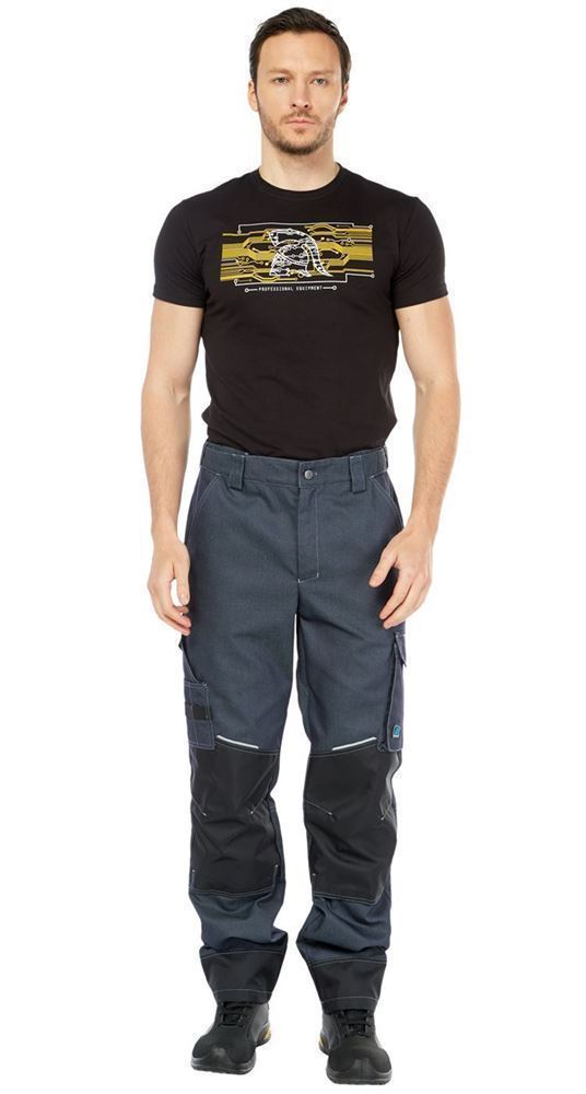 Брюки с застежкой на гульфик с молнией и джинсовую пуговицу на поясе. Пояс со шлевками для ремня. Эффективная эластичная регулировка объема по талии. Верхние карманы с наклонным входом. Боковые накладные карманы в области середины бедер: слева карман-полупортфель с клапаном, справа - для инструментов с отделом для ручки, а также со стропой и петлей для молотка.