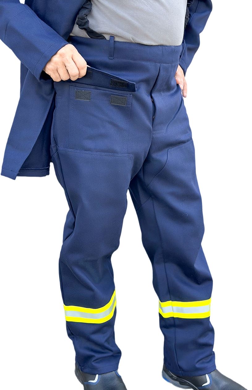 ➠ Брюки с притачным поясом, застежка гульфика на пуговицы. На правой передней половинке – накладной карман с клапаном. Передние половинки с усилительными накладками от линии бедра до низа с заходом на боковые швы. Брюки с бретелями. Нитки и фурнитура огнестойкие. По низу брюк расположен СОП 50 мм, огнестойкий.