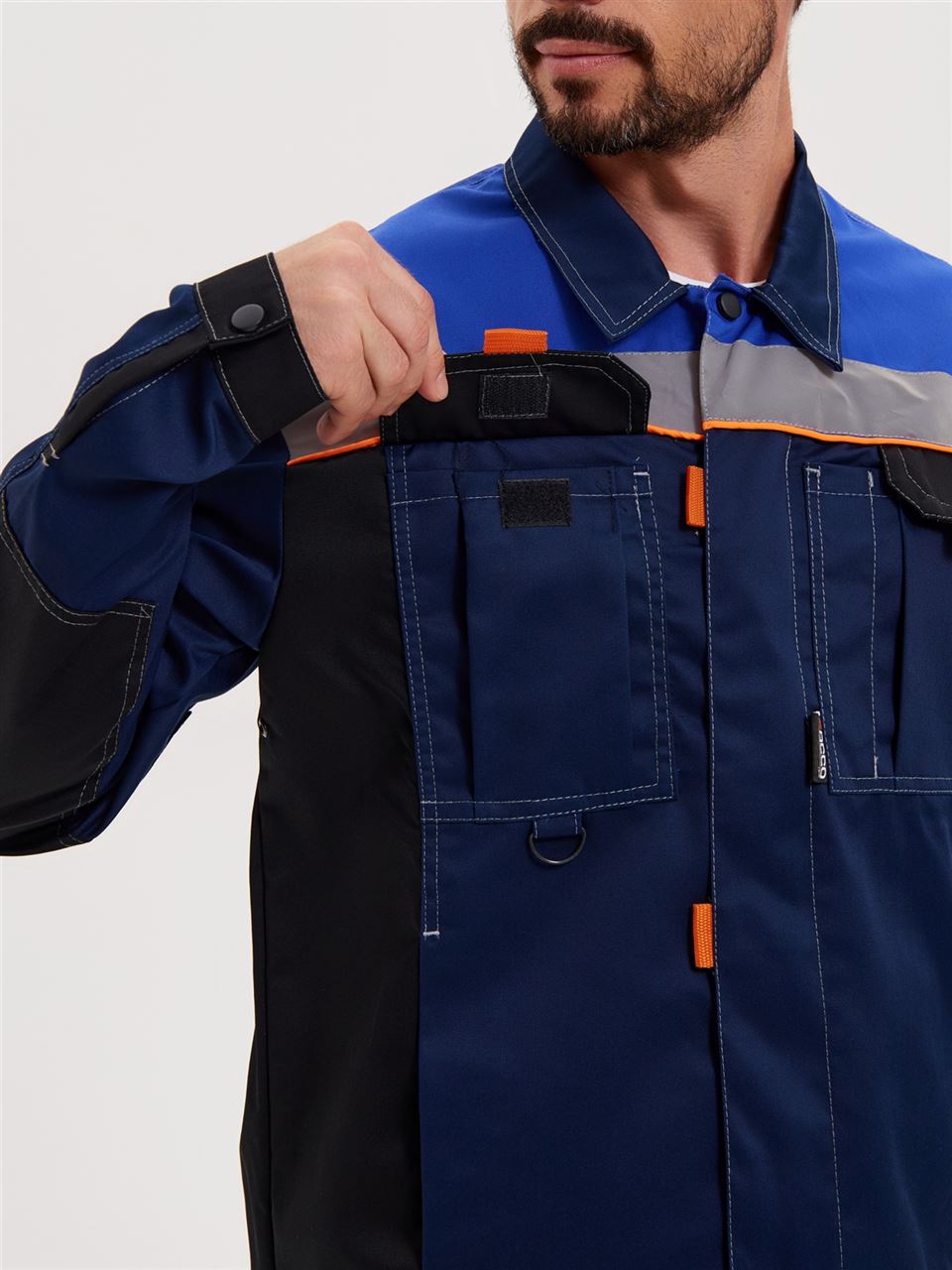 В подмышечных впадинах – люверсы. Светоотражающие полосы шириной 50 мм расположены: спереди в верхней части кокетки, что позволяет обеспечить видимость работника как спереди, так и с верху; на спине - по линии кокетки на полочке.