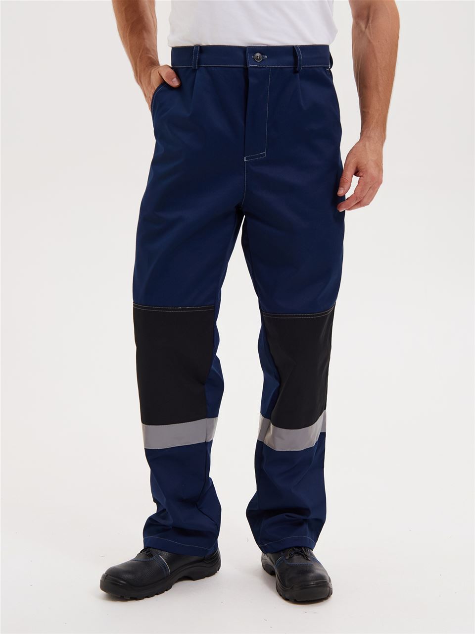 Брюки на притачном поясе. Гульфик на молнии. На передних половинках брючин имеются боковые накладные карманы с косым входом. Усиления в области коленей. На спинке объем талии регулируется при помощи резинки. Светоотражающая полоса расположена ниже колен.
