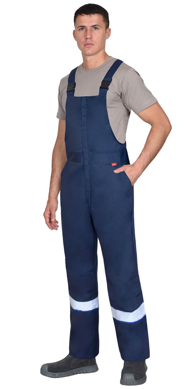 Полукомбинезон с центральной застёжкой в среднем шве передних половинок на молнию, накрытую ветрозащитным клапаном от верха нагрудника. Полукомбинезон с внутренними боковыми карманами, с накладками со стороны задних половинок, со стяжкой на резинку по линии талии спинки. Полукомбинезон с бретелями, длина которых регулируется. Понизу полукомбинезона предусмотрена лента светоотражающая 50 мм для обозначения сигнальной видимости.
