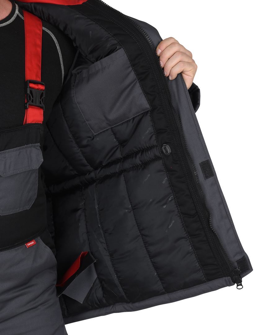 Куртка прямого силуэта, длинная, с притачной утеплённой подкладкой, с прокладкой из ткани "Лаке", с пристёгивающимся утеплённым капюшоном, с воротником стойка, с центральной застёжкой на 2-х замковую тесьму-"молнию", с ветрозащитной планкой на липучке, с подрезными бочками, с верхними фигурными карманами, с нижними прорезными карманами на "молнии". Низ регулируется при помощи хлястиков и липучки. Рукава резные, ширина внизу регулируется при помощи хлястиков и липучки. Полукомбинезон с притачной утеплённой подкладкой, с центральной потайной застёжкой на 2-х замковую тесьму "молнию", верхними накладными карманами с клапаном и нижними внутренними боковыми карманами, с наколенниками, с многофункциональным накладным карманом на левом боковом шве с клапаном и патой на ленте "контакт". На задней правой половинке один верхний и 2 нижних кармана для инструмента, настроченные один на другой, также предусмотрена шлёвка для инструмента.
