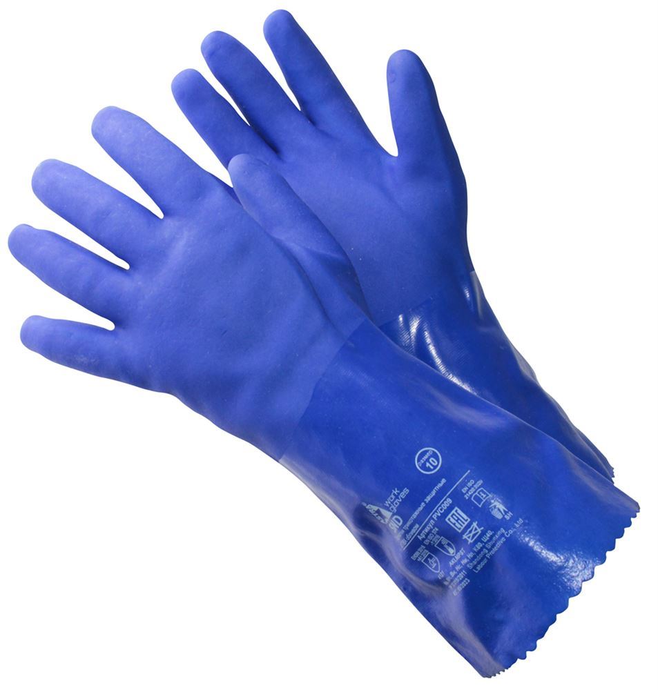 Покрытие поливинилхлоридом. Равномерное покрытие всей перчатки целиком поливинилхлоридом синего цвета. Покрытие является стойким к маслам, кислотам, щелочам, что подтверждено сертификатом. Водонепроницаемы.
