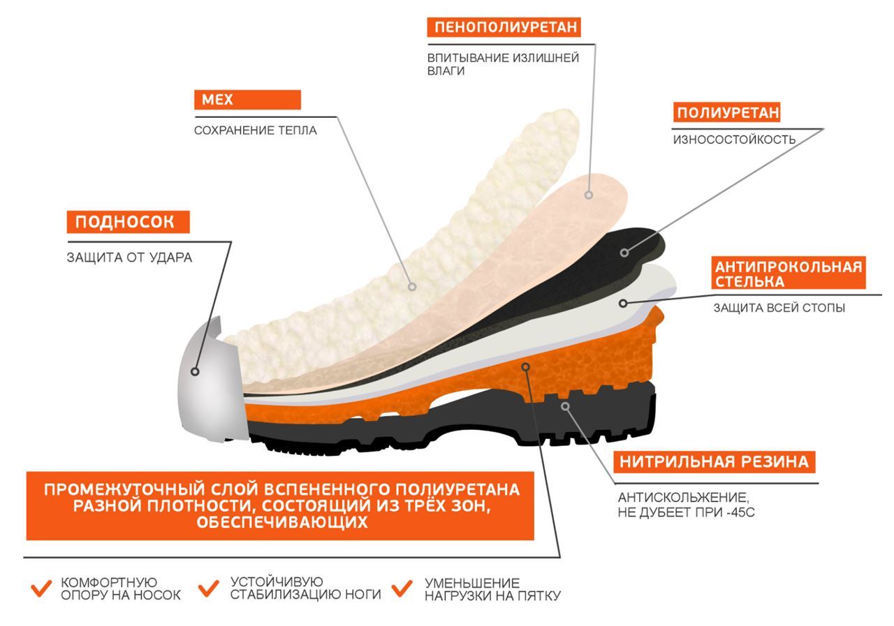Водонепроницаемые (благодаря методу прилива слоев друг другу они становятся полностью непроницаемые сверху до низу), теплые (полиуретан – отличный теплоизолятор), нескользящие на любой поверхности (благодаря особым полимерам в составе подошвы).