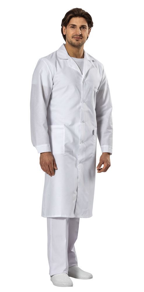 Халат с застежкой на пуговицы, отложным воротником, накладными карманами. Рукав длинный на манжете. Объем по талии регулируется хлястиком.