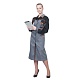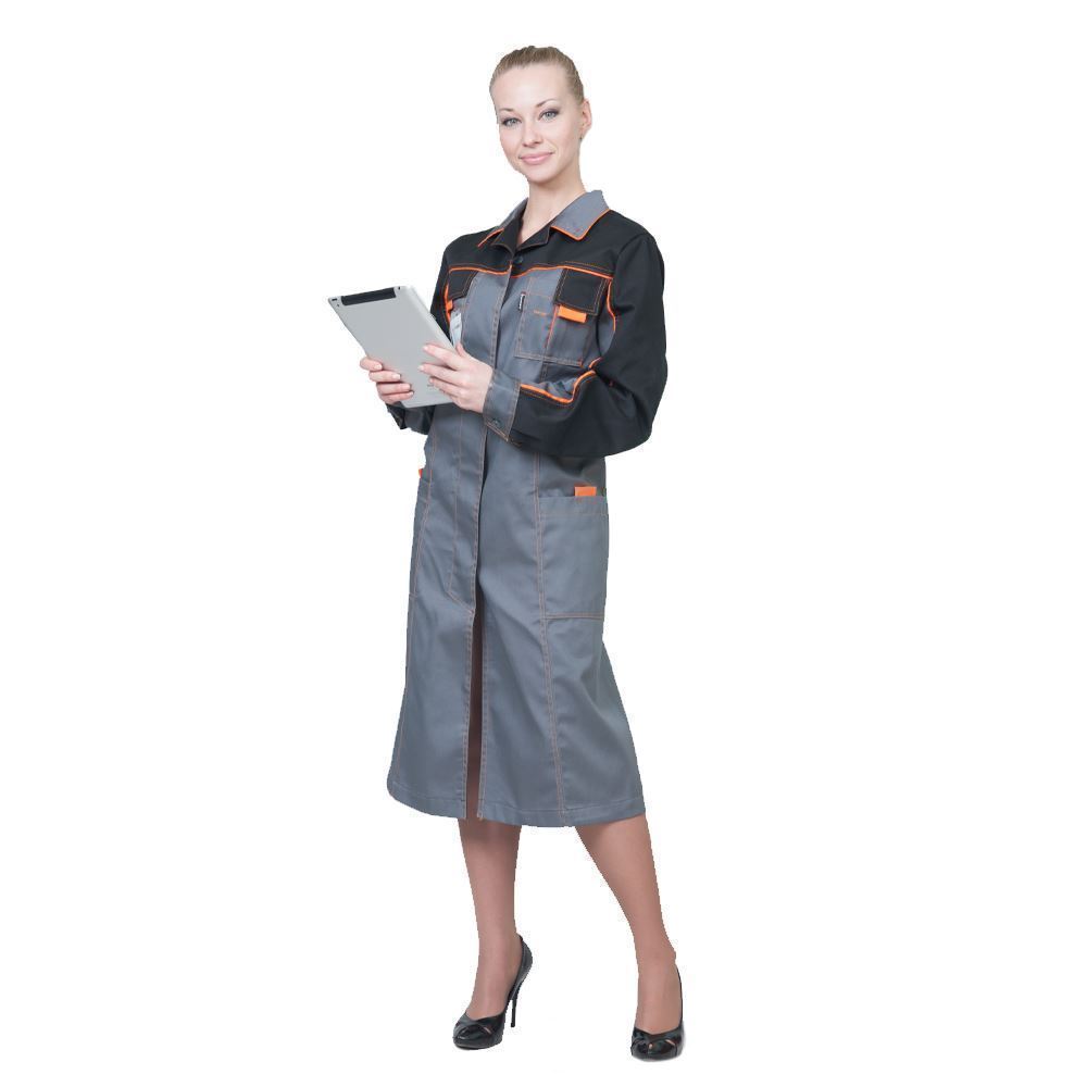 Халат женский: прямого силуэта, со шлицей, центральная супатная застежка на пуговицы. Полочка и спинка на кокетке с кантом и рельефами. На спинке люверсы для вентиляции. Рукава втачные, трехшовные с отделочным кантом, с манжетами, с декоративным разрезом в нижнем шве. Воротник отложной, с кантом.