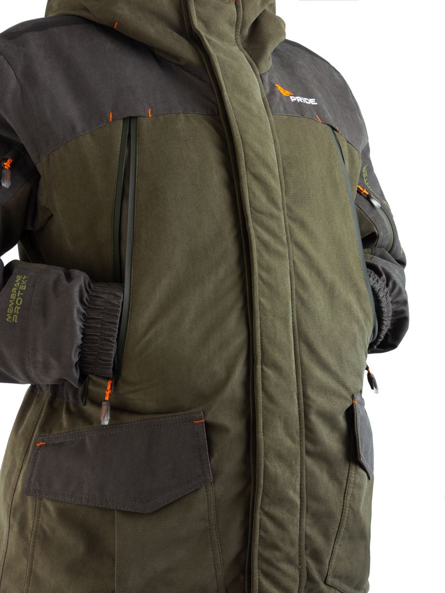 Костюм состоит из куртки и брюк. На куртке расположены 7 карманов, 2 вместительных вертикальных на влагозащитных молниях, 2 объемных нижних с клапанами на магнитных кнопках, 2 на руквах и 1 внутренний на подкладке.. Интегрированный регулируемый капюшон с высокой стойкой. Две ветрозащитные планки на магнитных кнопках. Эластичные кулисы в области талии и локтей формируют атлетический силуэт. Утяжки по низу куртки для регулировки оъема.