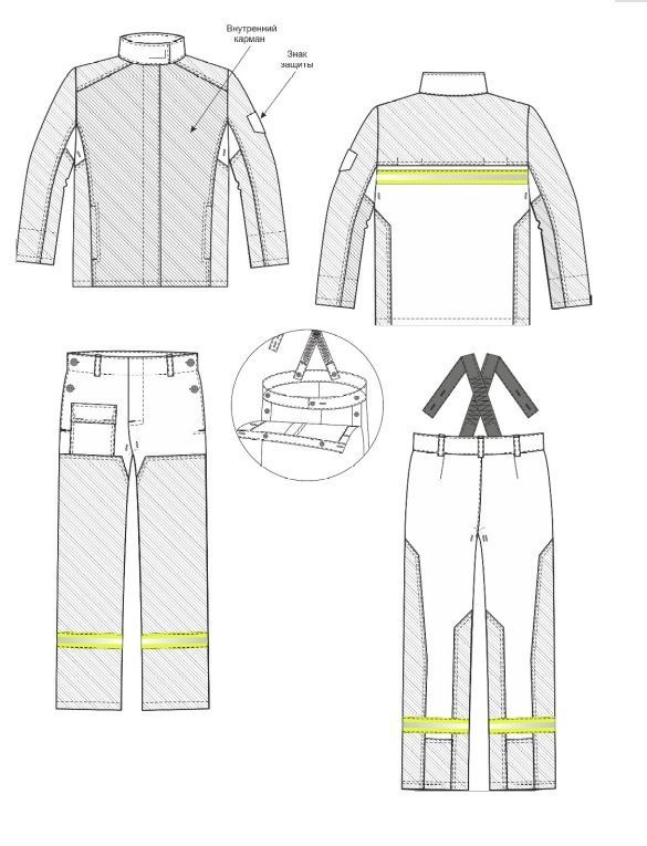 ➠ Брюки с притачным поясом, застежка гульфика на пуговицы. На правой передней половинке – накладной карман с клапаном. Передние половинки с усилительными накладками от линии бедра до низа с заходом на боковые швы. Брюки с бретелями. Нитки и фурнитура огнестойкие. По низу брюк расположен СОП 50 мм, огнестойкий.