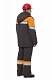 Удлиненная куртка с центральной застежкой на двухзамковую молнию и двойную ветрозащитную планку с кнопками. Воротник-стойка с трикотажной отделкой. Пристегивающийся капюшон с регулировкой объема в затылочной части и по лицевому срезу. Два верхних вертикальных кармана, застегивающиеся на молнию, два нижних накладных кармана и один внутренний карман на груди с застежкой на контакную ленту. На левой полочке в области груди расположен карман с экраном из мягкого пластика. Рукава с трикотажными напульсниками. Объем по линии талии спинки регулируется при помощи эластичного шнура и кулиски.