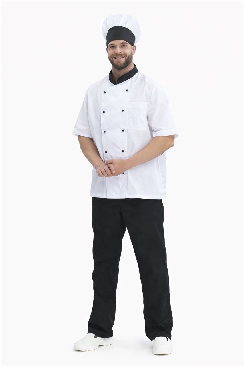 Костюм для повара «Шоколад» включает в себя три предмета: китель, брюки и поварской колпак. Спецодежда изготовлена в соответствии с ГОСТ, надежно защищает от общих производственных загрязнений. Костюм поварской выполнен из плотной ткани с водоотталкивающей пропиткой, отличается длительным сроком службы и классическим дизайном. Белый китель для повара оснащен двубортной застежкой на пукли и воротником-стойкой контрастного черного цвета. Прямой силуэт и свободный фасон кителя обеспечивают комфорт во время работы. Короткий рукав не мешает приготовлению пищи, а нагрудный карман подходит для хранения записей. Прямые черные брюки с поясом на резинке отлично сидят по фигуре и идеально дополняют китель повара. Белый колпак регулируется по объему головы с помощью липучки на затылке. Колпак повара универсален: высота тульи 9 см, общая высота – 25 см.