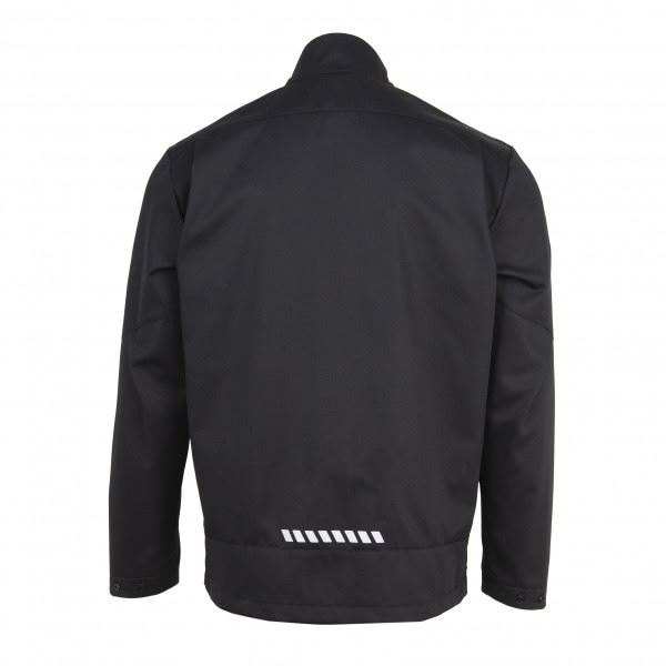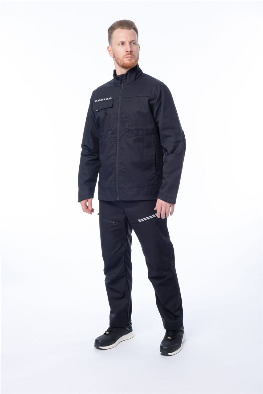 Куртка застёгивается на молнию. Сверху молния оформлена специальной подпланкой, защищающей кожу шеи и подбородка от защемления застёжкой. Воротник-стойка защищает от ветра и придаёт опрятный внешний вид. На спинке и рукавах на уровне локтя размещены складки, что позволяет активно двигаться и чувствовать себя комфортно в любой рабочей ситуации. В области подмышек расположены люверсы для дополнительной вентиляции. По низу рукавов есть регулировка по объёму с помощью кнопок. На груди и спине добавлены светоотражающие элементы, обеспечивающие безопасность в тёмное время суток.
