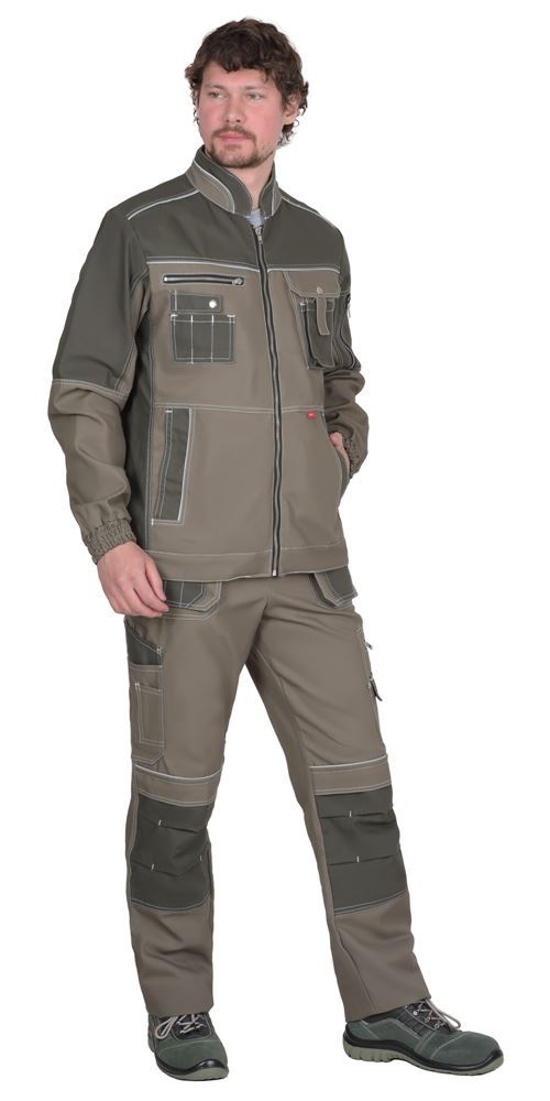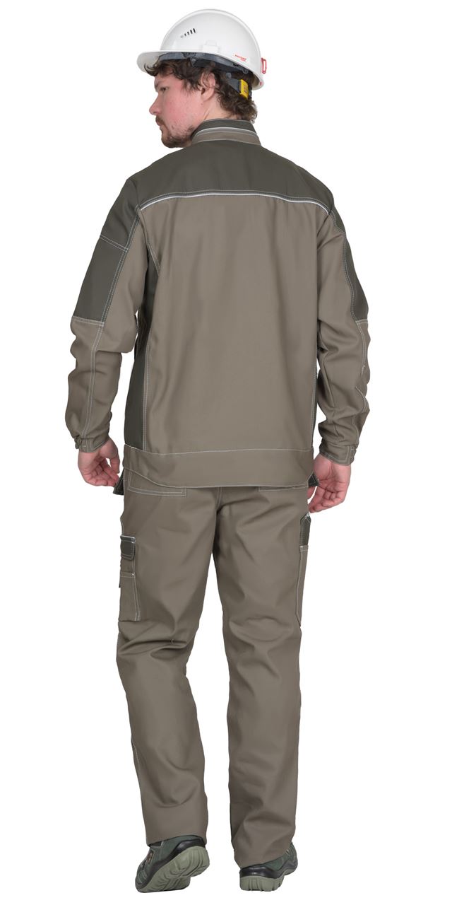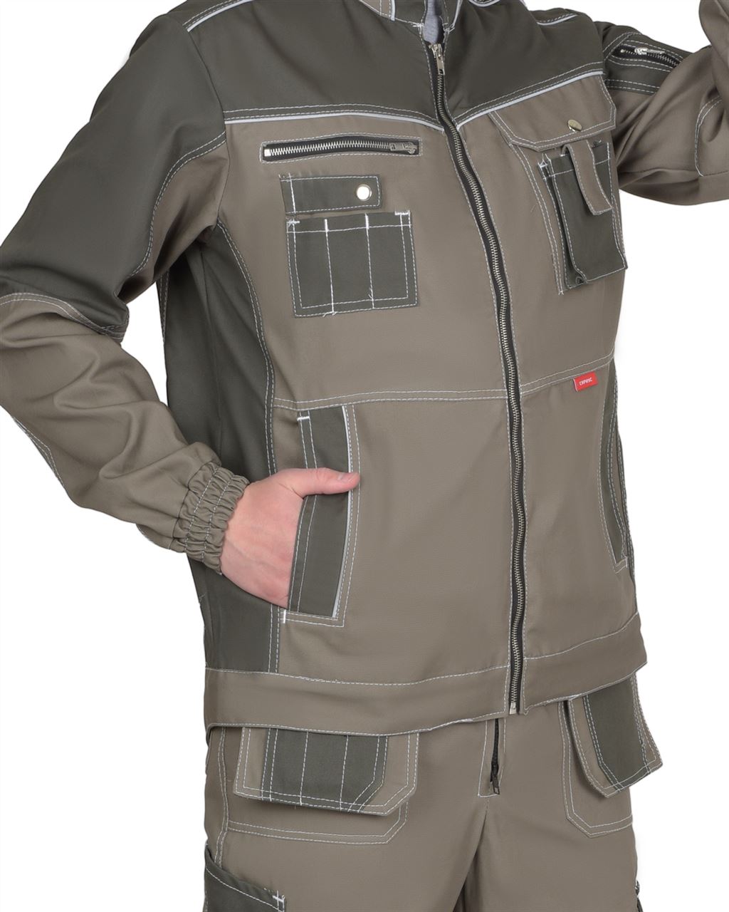 Куртка выполнена из ткани "Канвас Комфорт", прямого силуэта, с центральной застежкой на металлическую молнию, воротником - "стойкой", с различными многофункциональными карманами. Рукава втачные, левый с накладным карманом с застежкой на металлическую молнию, с притачными манжетами, частично стянутыми резинкой. В куртке предусмотрен кант СВ 3мм светоотражающий 100 К для обозначение видимости. На средней части левой полочки выполнены 2 кармана, настроченные один на другой с фигурным клапаном, застегивающимся на 1 кнопку. На средней части правой полочки в шве кокетки прорезной карман, в рамку, застегивающийся на металлическую молнию и накладной карман, разделенный на три секции с патой на кнопку. Нижние части полочек с прорезными карманами в листочку с наклонным входом. Воротник – стойка с кантом СВ 3мм. Пояс фигурный формы.