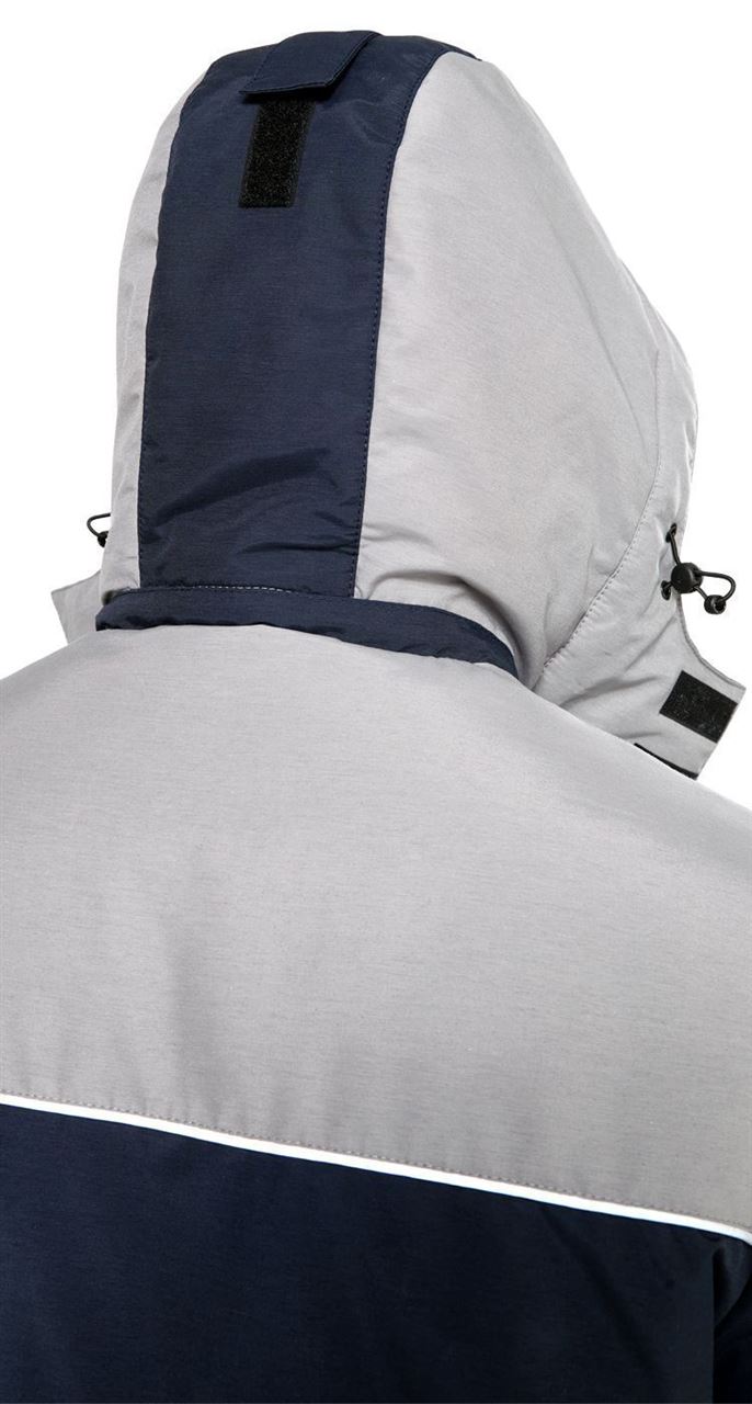 В верхней части рабочей куртки, по низу деталей кокеток из отделочной ткани спереди и сзади расположены световозвращающие канты для безопасности в условиях плохой видимости.