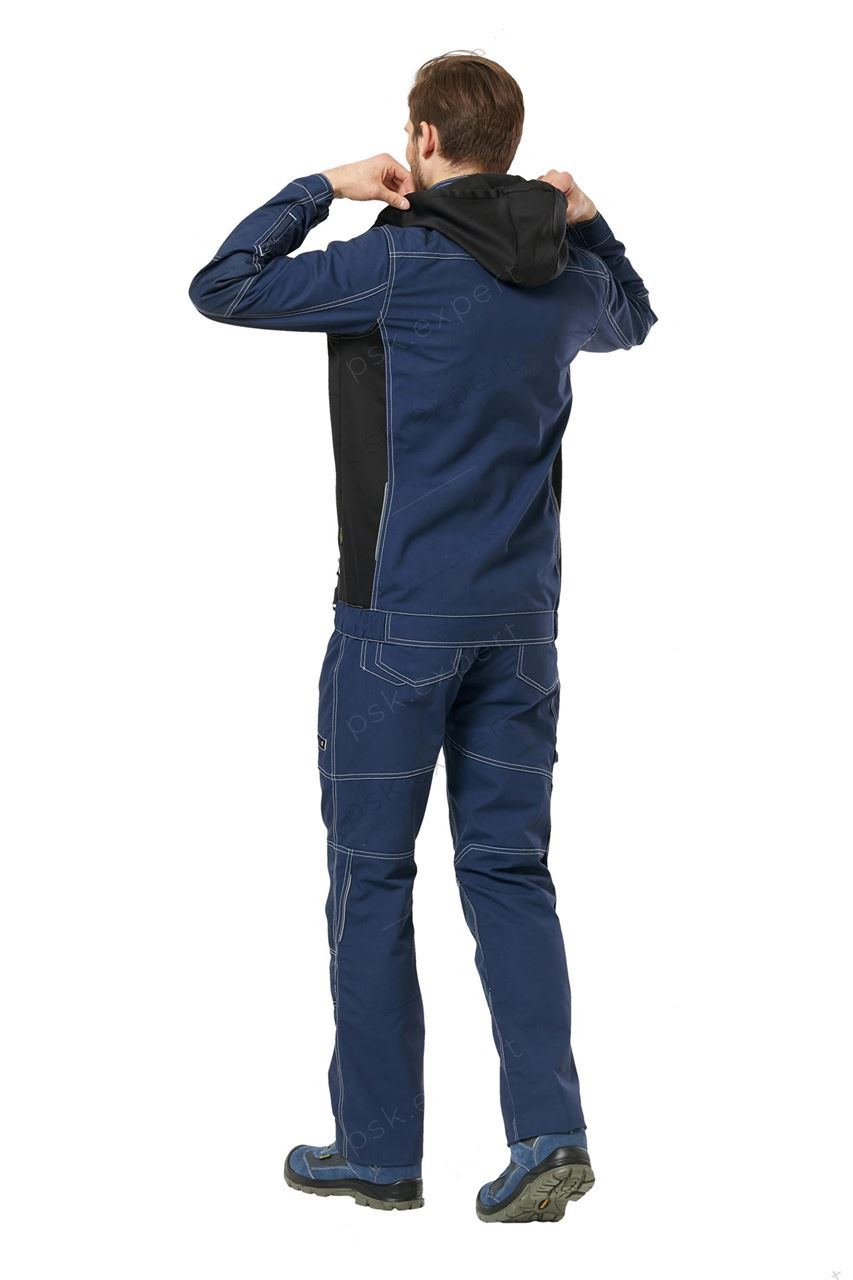 Куртка летняя и демисезонная из прочной смесовой ткани темно-синего цвета, с отделкой из эластичной ткани Софтшелл черного цвета, для защиты от общих производственных загрязнений.
