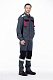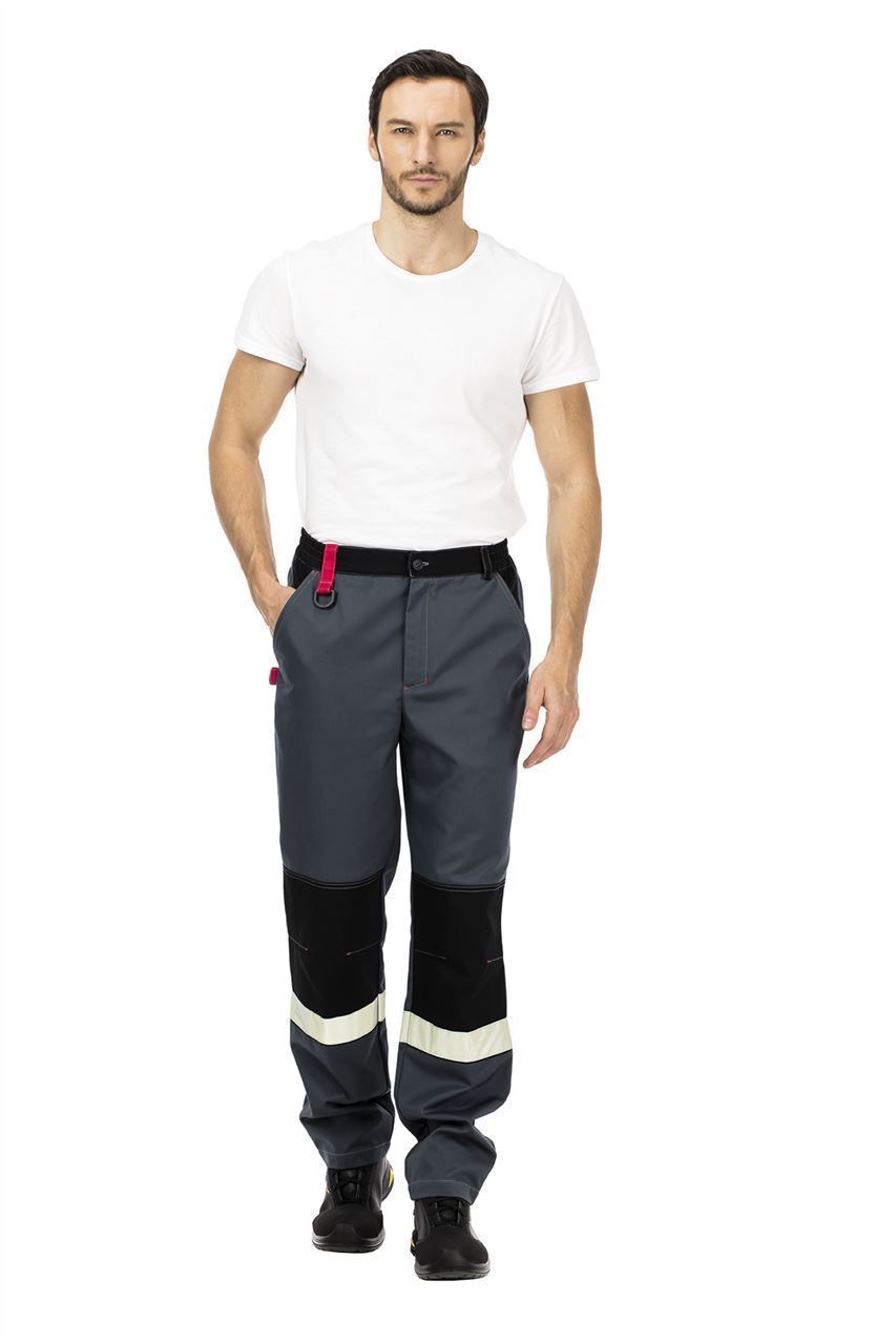 Брюки с застежкой на гульфик с молнией и пуговицей на поясе. Пояс со шлевками для ремня, одна из них из отделочного материала с пластиковым полукольцом для крепления карабина или пропуска. Регулировка объема по талии - за счет боковых вставок с эластичной тесьмой. На передних половинках верхние карманы с боковым входом. На задних половинках верхние накладные карманы с фигурными клапанами, а также петля для инструментов. В области колен - усилительные накладки.