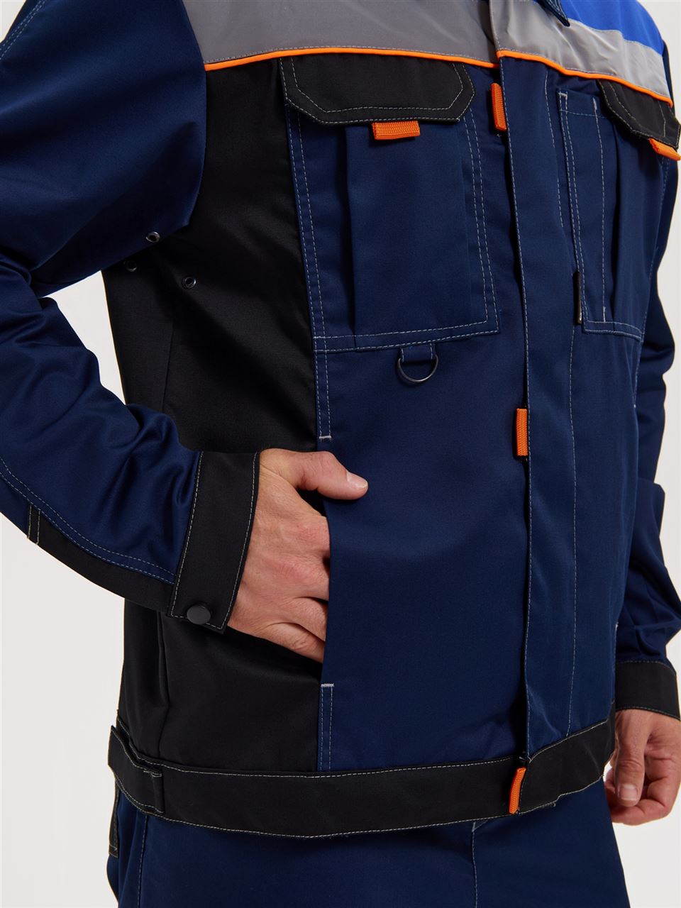 В подмышечных впадинах – люверсы. Светоотражающие полосы шириной 50 мм расположены: спереди в верхней части кокетки, что позволяет обеспечить видимость работника как спереди, так и с верху; на спине - по линии кокетки на полочке.