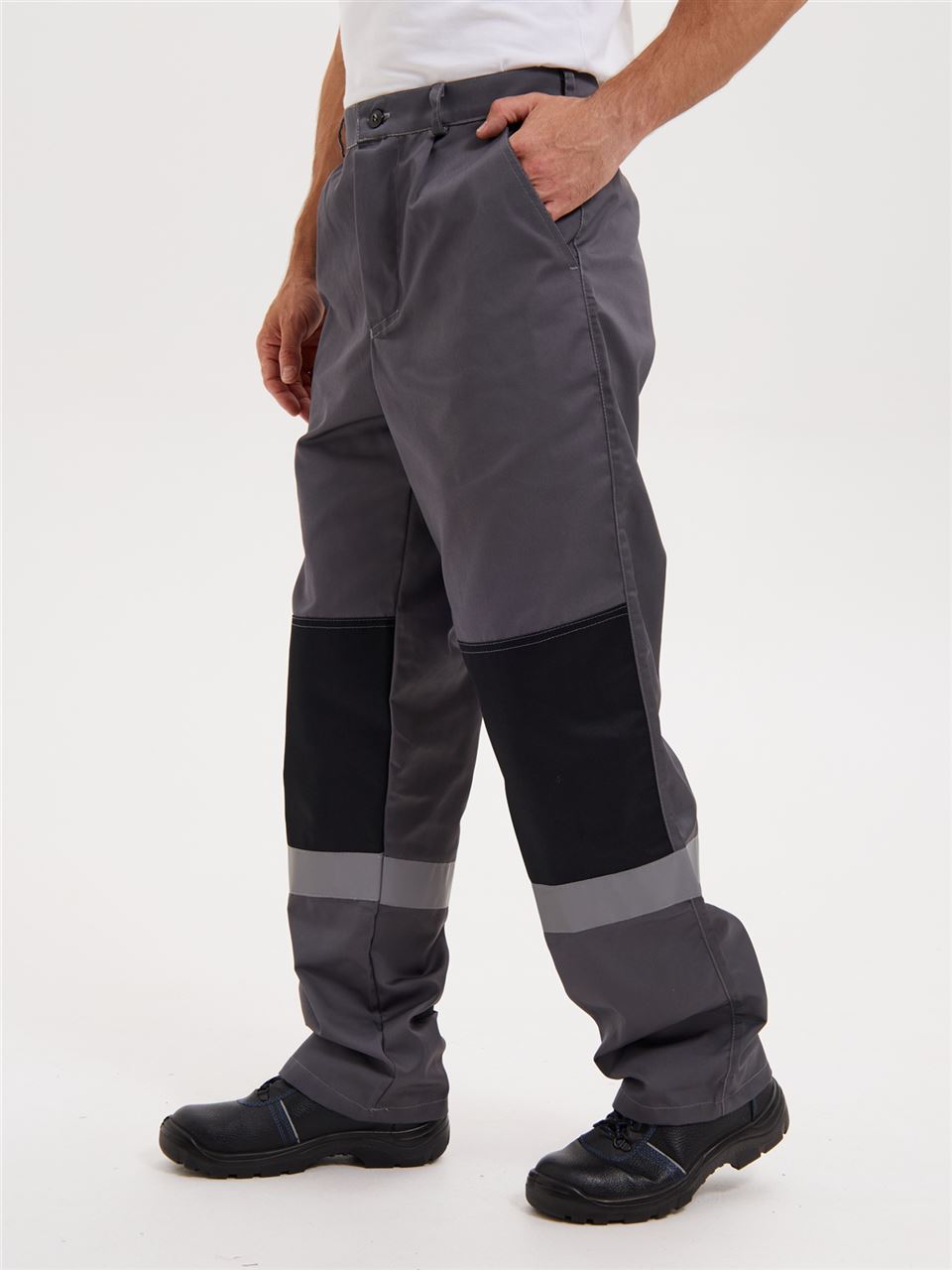 Брюки на притачном поясе. Гульфик на молнии. На передних половинках брючин имеются боковые накладные карманы с косым входом. Усиления в области коленей. На спинке объем талии регулируется при помощи резинки. Светоотражающая полоса расположена ниже колен.