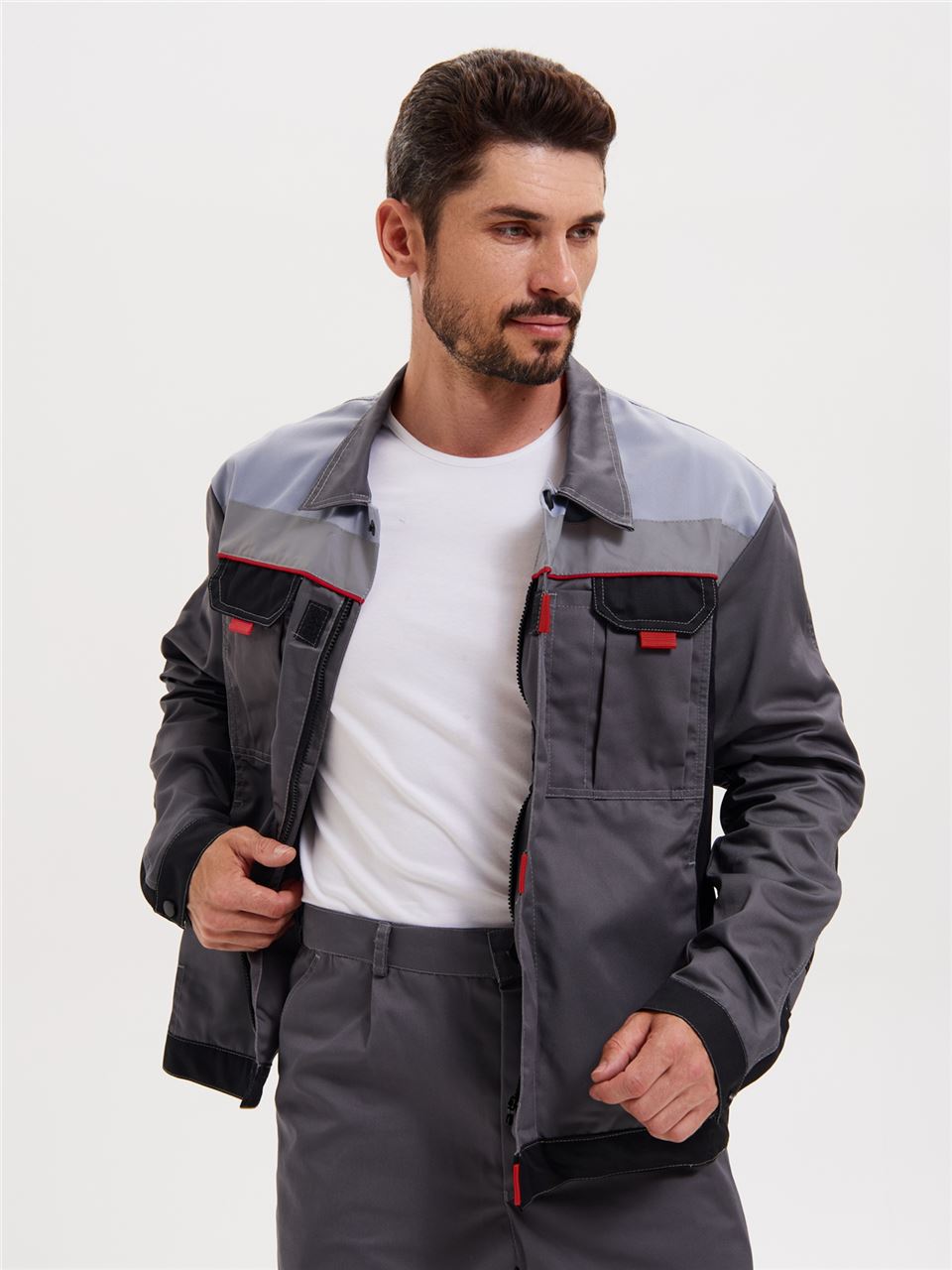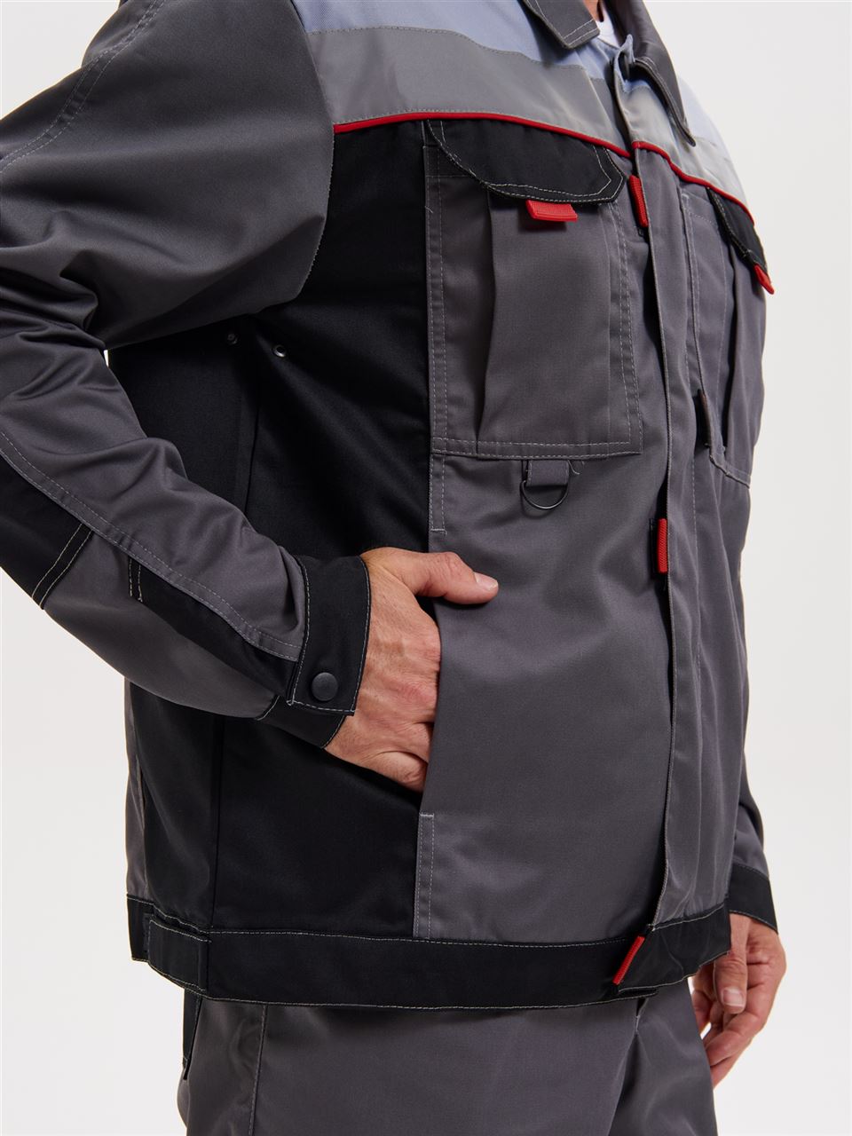 Куртка оснащена двумя боковыми врезными и двумя нагрудными накладными много- функциональными карманами. На левом кармане имеется отделение для ручек. На правом кармане расположена рамка с пленкой с боковым входом для бейджа.