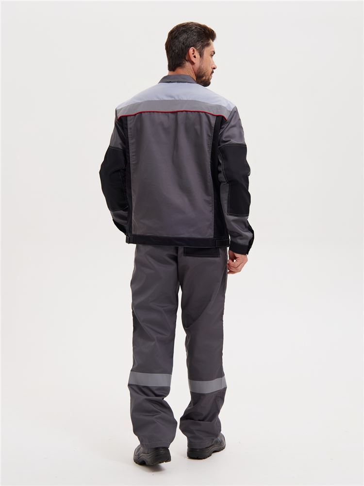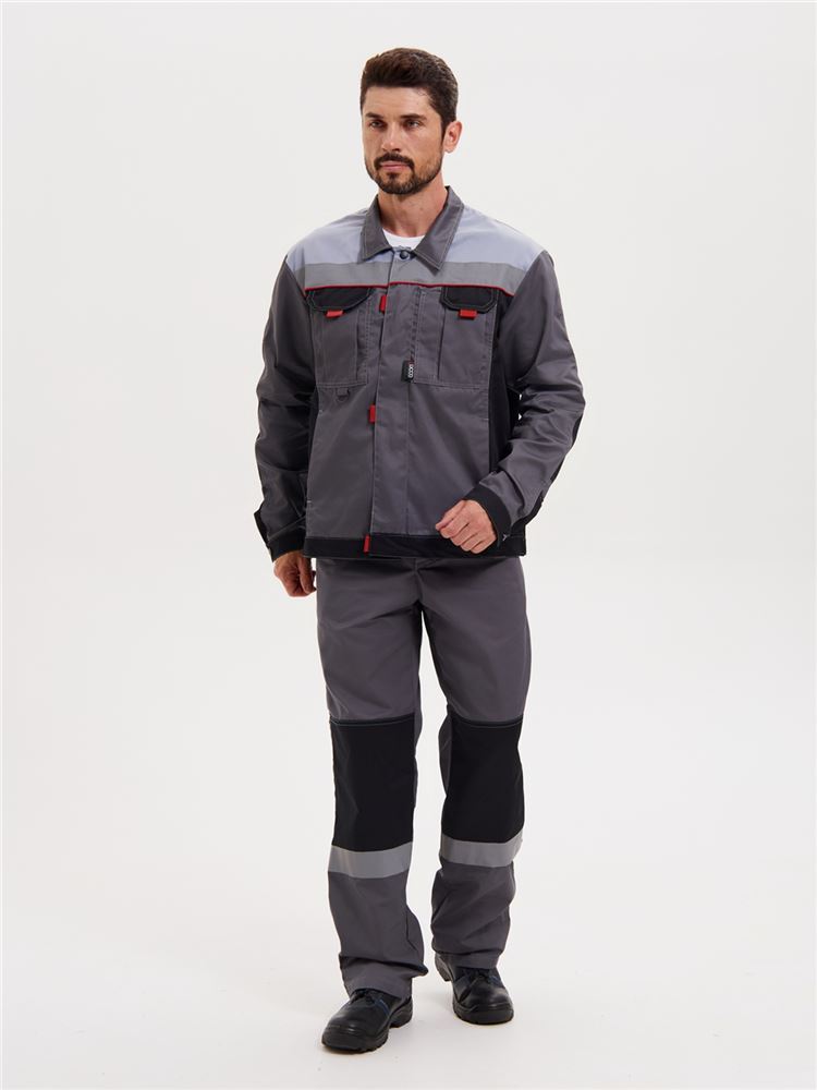 Костюм состоит из куртки и брюк. Куртка укороченная с центральной супатной застежкой на молнию и контактную ленту, с притачным поясом, с втачными рукавами и отложным воротником. Усиления в области локтей.