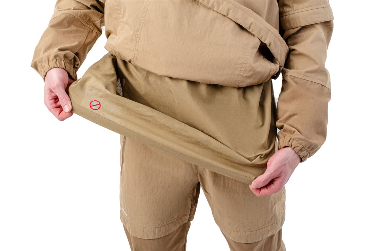 Костюм оснащен специальными ловушками для клещей, внутри куртки предусмотрен дополнительный слой хлопковой трикотажной ткани, которая заправляется в брюки для максимальной защиты от проникновения внутрь изделия. Рукава оснащены плотными трикотажными манжетами. На капюшоне предусмотрена молния для противомоскитной сетки, которая компактно укладывается в карман на груди. В передней части куртки предусмотрен объемный передний влагозащитный карман и два боковых. Этот костюм отлично подойдет для всех, кто часто и долго бывает в лесу. Для обеспечения безопасности в темное время суток вся печать на изделии является светоотражающей.