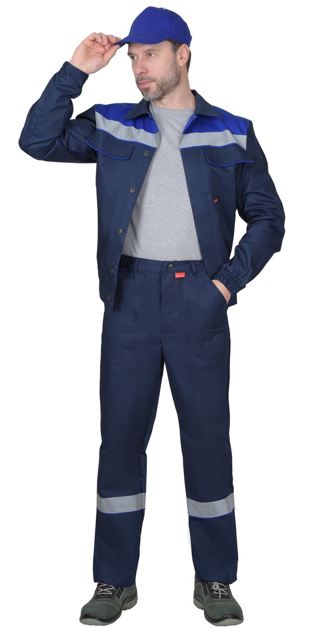 Костюм «СИРИУС-МАСТЕР» состоит из куртки и брюк. Куртка короткая, с отложным воротником с центральной потайной застежкой на четыре петли и пуговицы и 1шт. верхняя сквозная; с притачным поясом с застежкой на одну петлю и пуговицу частично стянутым резинкой ткацкой по боковым швам; с нагрудными накладными карманами с клапанами застегивающиеся на потайную ленту «контакт»; с нижними накладными карманами. Рукава втачные, с притачными манжетами, частично стянутыми на резинку ткацкую. В куртке предусмотрена лента светоотражающая СОП (серая) ш.50мм для обозначения сигнальной видимости. Брюки прямого покроя с притачным поясом, застёгивающимся на одну пуговицу, пояс, регулирующийся по ширине при помощи ткацкой резинки по бокам; с 5-ю узкими шлевками; с застёжкой гульфика на три пуговицы; с двумя боковыми накладными карманами с наклонным входом. В брюках предусмотрена лента светоотражающая СОП (серая) ш.50мм для обозначения сигнальной видимости и кант готовый д.3мм контрастного цвета.