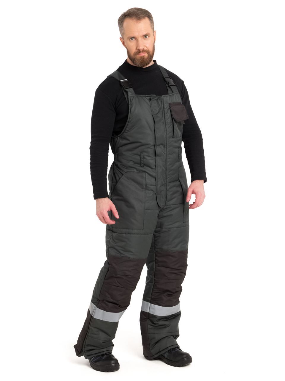 Костюм состоит из куртки и полукомбинезона. Куртка со светоотражающими полосами и кантом, с центральной застежкой на молнию, ветрозащитным клапаном на текстильную застежку с чередованием кнопок и внутреннюю планку с уголком для защиты подбородочной части от молнии. Воротник стойка, с внутренней стороны флис, съемный утепленный капюшон. На правой полочке нагрудный карман для бейджа. Рукава с внутренними трикотажными манжетами. Полукомбинезон со светоотражающими полосами , с центральной застежкой на молнию и планку на текстильную застежку, на регулируемых по длине бретелях. На правой передней половинке нагрудный карман для сотового телефона. На спинке, по линии талии в области боковых швов, кулиса.