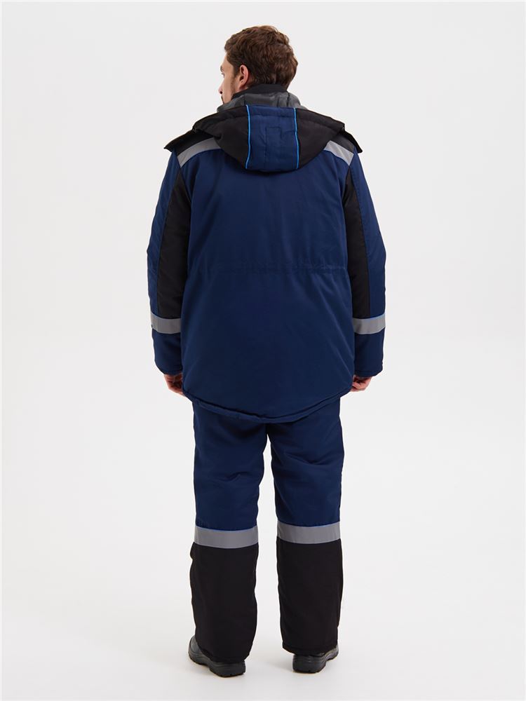 Костюм состоит из куртки и полукомбинезона. Подкладка костюма усилена ветрозащитной тканью. Куртка с центральной застежкой – “молнией”, закрытой ветрозащитной планкой на липучках. Нагрудные карманы закрыты клапаном на липучках. Объёмные нижние накладные карманы с клапанами на липучках. Под левым нагрудным карманом полукольцо для крепления пропуска. Рукава с манжетами из мягкого трикотажа. Воротник утепленный на подкладке из флиса. Капюшон съемный, на молнии, с регулировкой объема. Спинка с удлиненным низом. Внутри куртки карман для телефона и небольших документов. По талии куртки кулиса для регулировки. Полукомбинезон с центральной застежкой на двухзамковую молнию. Бретели из эластичной резинки с регулировкой длины и с застежкой - фастекс. Спереди объемные накладные карманы с боковым входом. На спинке - эластичная тесьма для регулировки объема по талии. На кокетках спереди и спинке куртки, по низу рукавов, по низу брюк полукомбинезона расположен СОП шириной 50мм и канты контрастного цвета.
