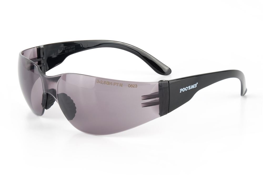 Защитное стекло из поликарбоната серого цвета с твердым покрытием на наружной стороне и с незапотевающим покрытием на внутренней, обращенной к глазу, стороне.