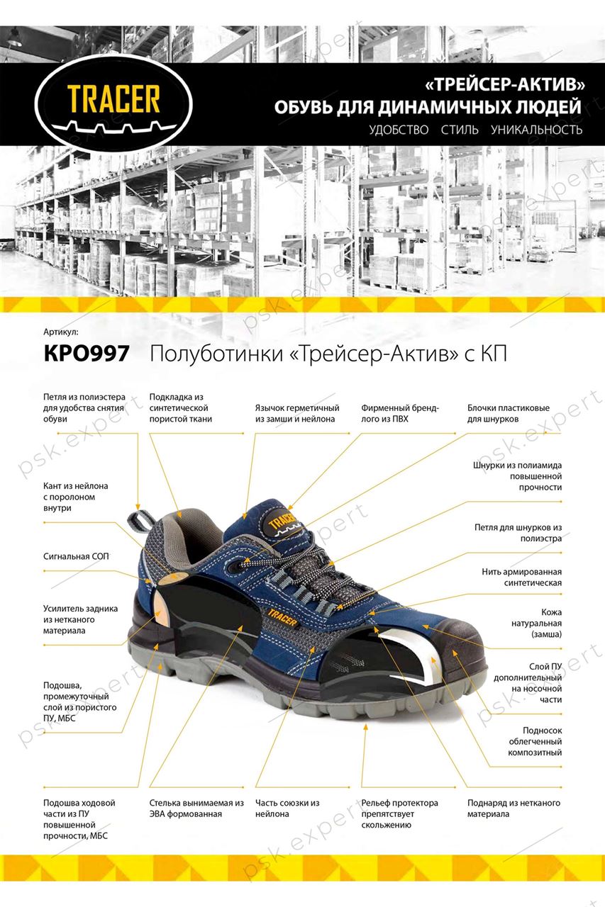 ■ Особенности конструкции: обувная колодка эргономичной формы, к заднику полуботинка пришита петля из полиэстера для удобства снятия обуви. Прочные двухцветные круглые плетеные шнурки из полиамида. Дополнительный залив полиуретаном носочной части обуви защищает от механических повреждений. Полное отсутствие металлических деталей делает эту обувь более легкой и комфортной в эксплуатации.
